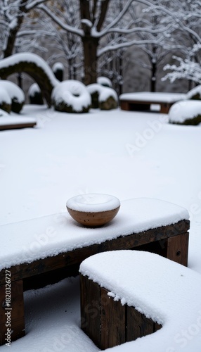 Serene Winter Garden Landscape Featuring Snow-Covered Wooden Benches and a Minimalistic Bowl Amidst a Tranquil Snowfall in a Quiet Outdoor Setting