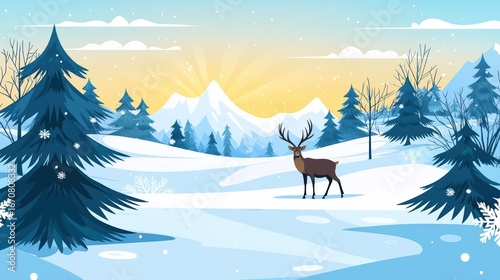 Serene Winter Landscape with Deer in Snowy Forest and Majestic Mountains at Dawn