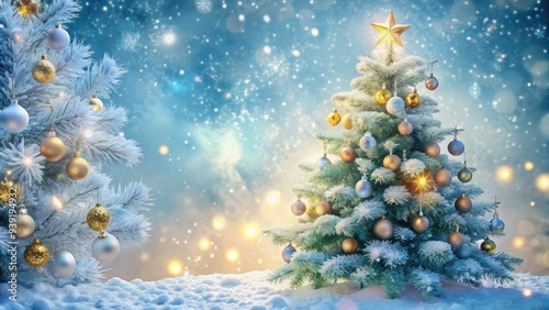Serene winter wonderland scene with snowflakes gently falling on a frosty Christmas tree adorned with twinkling lights and ornaments, amidst a soft white snow overlay.