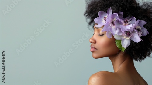 Serene woman with flowers in hair against a soft blue background.
