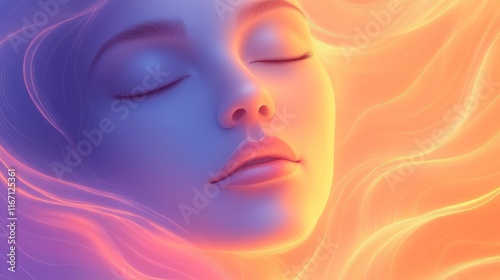Serene woman's face surrounded by vibrant, flowing light.