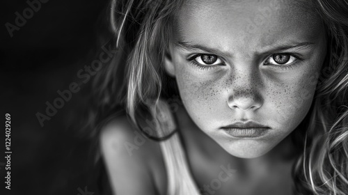 serious girl with freckles and long wavy hair gazing intensely in black and white portraiture with emotional depth and focus