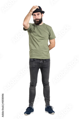 Serious young hipster putting black hat on his head. Full body length portrait isolated over white studio background.