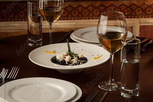 served table with glasses of wine on the background of painting