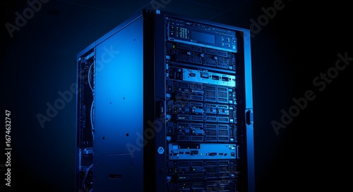 Server rack glowing with blue lights, advanced IT storage and processing system