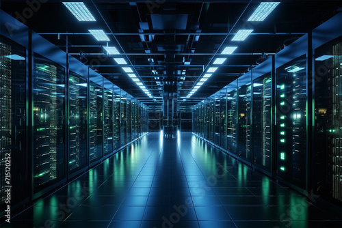 Server racks for modern data centers in a dark room with visual effects. Display of The concept of the Internet of Things, data flow, and digitalization of internet traffic. Multi-Level Electric Equip