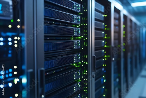 Server racks in a data center. Concept of technology, data, and digital infrastructure.