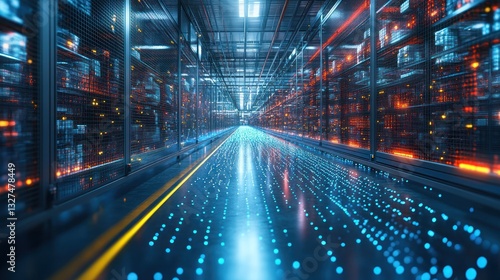 Server room data center with glowing servers and data flow