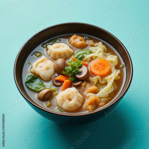 Serving Vegetable Dumpling Soup in Bowl on Turquoise Background