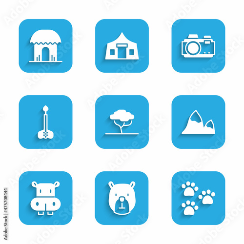 Set African tree, Bear head, Paw print, Mountains, Hippo or Hippopotamus, Arrow, Photo camera and hut icon. Vector