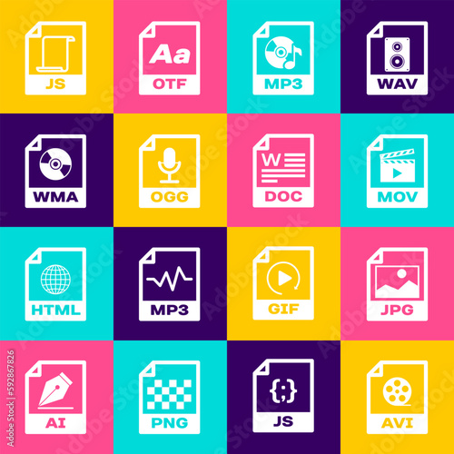 Set AVI file document, JPG, MOV, MP3, OGG and WMA icon. Vector