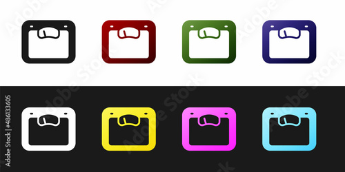 Set Bathroom scales icon isolated on black and white background. Weight measure Equipment. Weight Scale fitness sport concept. Vector