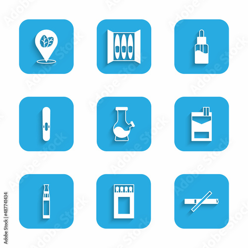Set Bong, Matchbox and matches, No smoking, Cigarettes pack, Electronic cigarette, Vape liquid bottle and Tobacco leaf icon. Vector