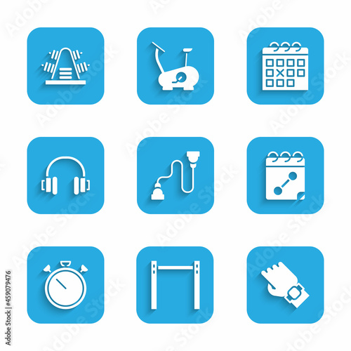 Set Chest expander, Horizontal bar, Smart watch hand, Calendar fitness, Stopwatch, Headphones, and Metal rack with weights icon. Vector