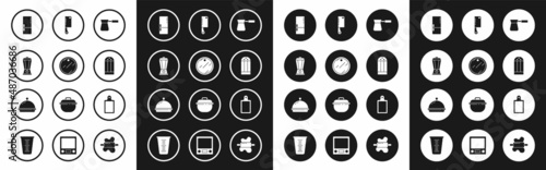 Set Coffee turk, Cutting board, Blender, Refrigerator, Salt, Meat chopper, and Covered with tray food icon. Vector