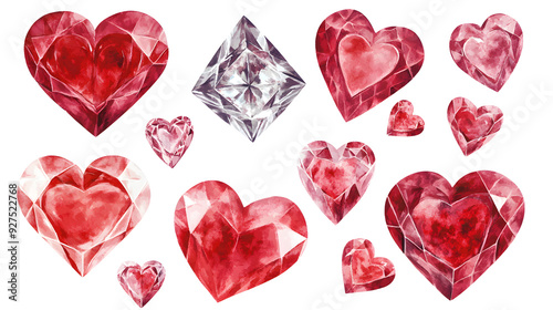 Set collection of beautiful different red hearts with diamonds isolated on transparent background.