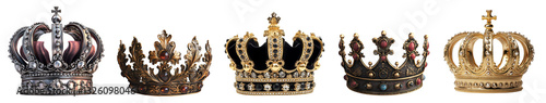 Set collection of elaborate gemstone diamond jewel crown tiara headpiece, royal king queen noble renaissance regal medieval on transparent cutout PNG. Many different style. Mockup template for design