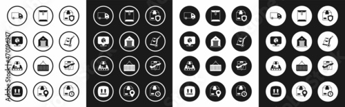 Set Delivery security with shield, Warehouse, Location cardboard box, cargo truck, Hand and boxes, Envelope, Plane and Conveyor belt icon. Vector