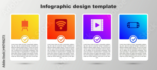 Set Easel or painting art boards, Wi-Fi wireless internet network, Play Video and Portable video game console. Business infographic template. Vector