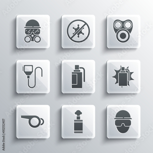 Set Hand grenade, Special forces soldier, Whistle, Walkie talkie, Gas mask and icon. Vector