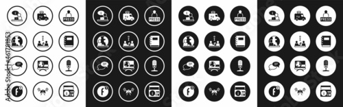 Set Journalist news, Interview, World, Television report, Notebook, TV News car, Microphone and Speech bubble chat icon. Vector