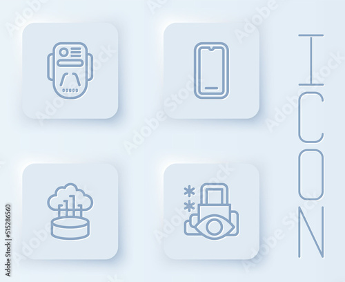 Set line Artificial intelligence robot, Mobile phone, Network cloud connection and Cyber security. White square button. Vector