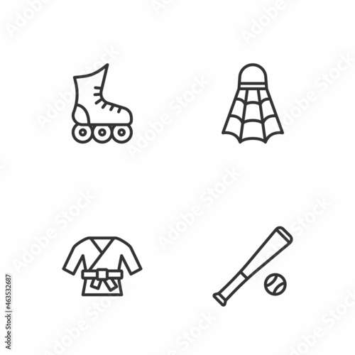 Set line Baseball bat with ball, Kimono, Roller skate and Badminton shuttlecock icon. Vector