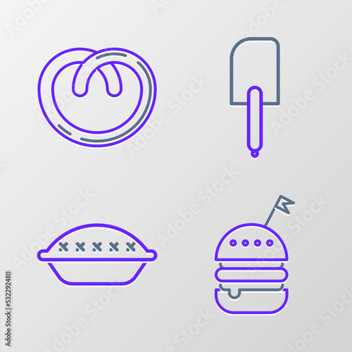 Set line Burger, Homemade pie, Spatula and Pretzel icon. Vector