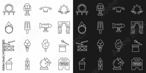 Set line Circus ticket, Magic hat and wand, curtain raises, Jester with bells, Ice cream, fire hoop, Roller coaster and Swing plane icon. Vector