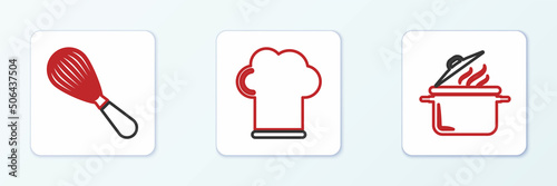 Set line Cooking pot, Kitchen whisk and Chef hat icon. Vector