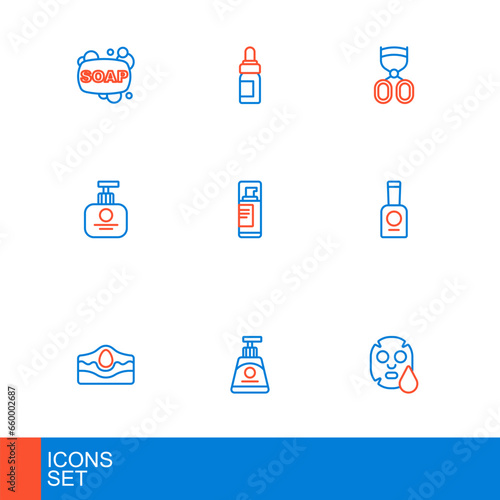 Set line Facial cosmetic mask, Cream or lotion tube, Acne, Bottle of nail polish, Tube hand cream, Shaving gel foam, Eyelash curler and Essential oil bottle icon. Vector
