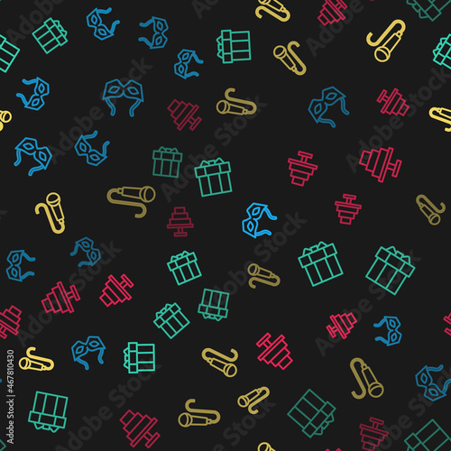 Set line Festive mask, Gift box, Microphone and Cake on seamless pattern. Vector