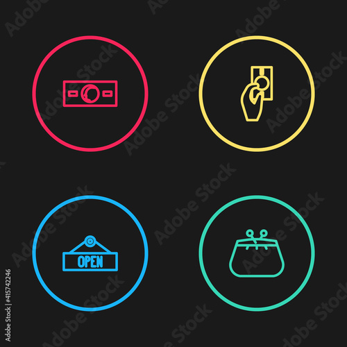 Set line Hanging sign with Open, Wallet, Hand holding money and Paper cash icon. Vector.