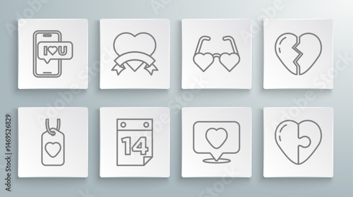 Set line Heart tag, Calendar with February 14, Like and heart, shaped love glasses, Broken and Mobile icon. Vector