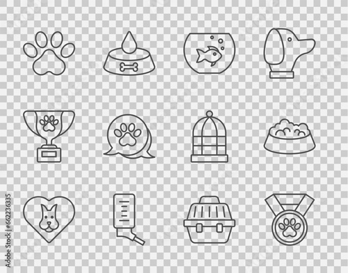 Set line Heart with dog, Pet award symbol, Aquarium fish, Drinker for small pets, Paw print, carry case and food bowl cat icon. Vector