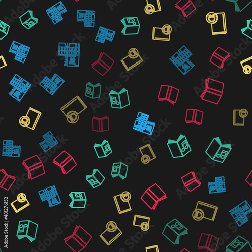 Set line Mall or supermarket building, Audio book, and Open on seamless pattern. Vector