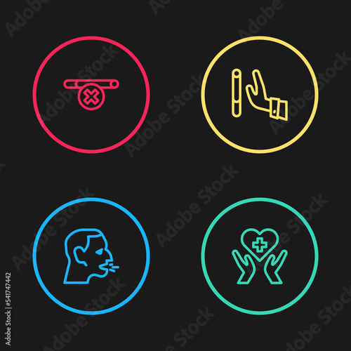 Set line Man coughing, Heart with cross, Giving up cigarette and No smoking icon. Vector