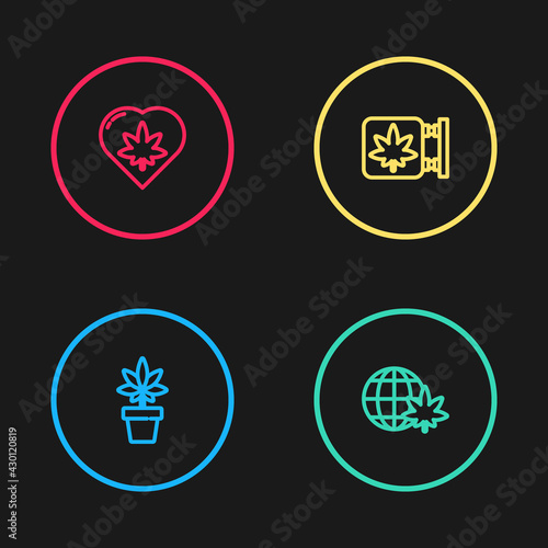 Set line Marijuana or cannabis plant, Legalize marijuana globe, and store and leaf in heart icon. Vector