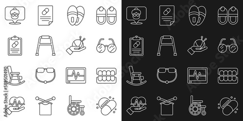 Set line Medicine pill or tablet, False jaw, Eyeglasses, Slippers, Walker, Medical prescription, Nursing home and Yarn ball with knitting needles icon. Vector