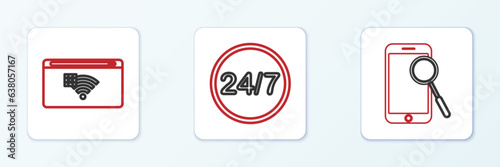 Set line Mobile phone diagnostics, No Internet connection and Clock 24 hours icon. Vector