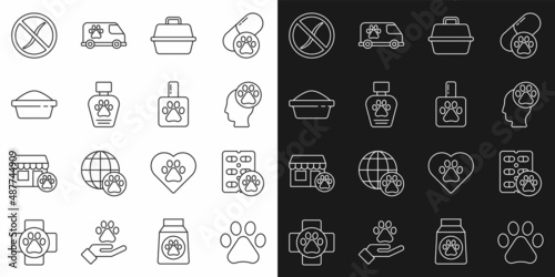 Set line Paw print, Dog pill, Human with animals footprint, Pet carry case, shampoo, food bowl, Anti worms parasite and icon. Vector