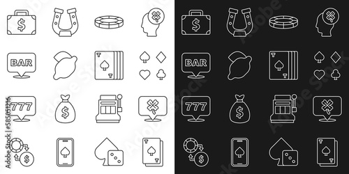 Set line Playing card with spades, Casino slot machine clover, Deck of playing cards, chips, lemon, Alcohol bar location, Briefcase and money and icon. Vector