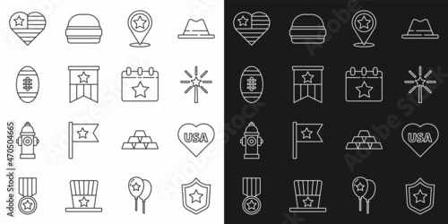 Set line Police badge, USA Independence day, Firework, American flag, Football ball, and Calendar with date July 4 icon. Vector