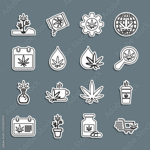 Set line Shopping cart with marijuana, Cup coffee, Magnifying glass and, Test tube, Marijuana or cannabis leaf oil, Calendar, Planting and icon. Vector