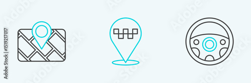 Set line Steering wheel, Gps device with map and Location taxi icon. Vector