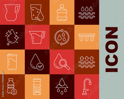 Set line Water tap, Waves of water and evaporation, filter, Big bottle with clean, Jug glass, drop, and Recycle aqua icon. Vector