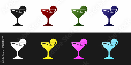 Set Margarita cocktail glass with lime icon isolated on black and white background. Vector