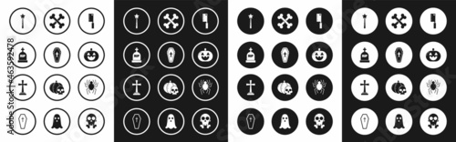 Set Meat chopper, Coffin with christian cross, Tombstone RIP, Magic wand, Pumpkin, Crossed bones, Spider and icon. Vector