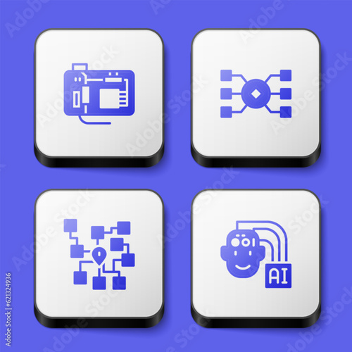 Set Motherboard, Neural network, and Humanoid robot icon. White square button. Vector