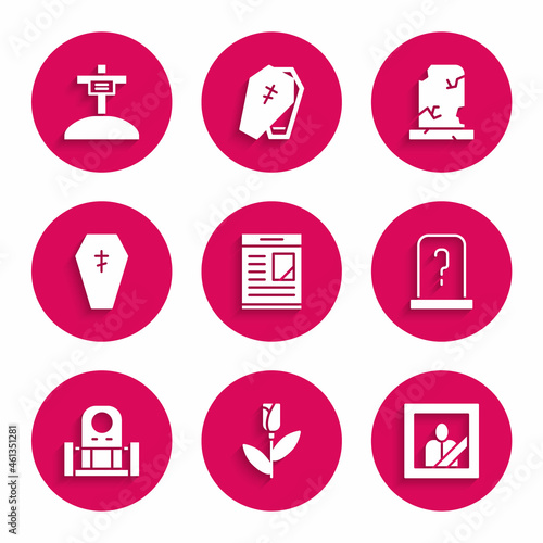 Set Obituaries, Flower rose, Mourning photo frame, Grave with tombstone, Coffin cross, Old grave and icon. Vector